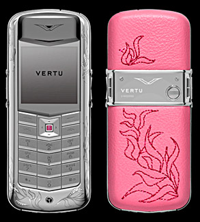 Модель ; Vertu Constellation Vivre Pink SE. Полированная нержавеющая сталь, рамка передней панели с гравировкой, белые бриллианты, розовая кожа с вышивкой