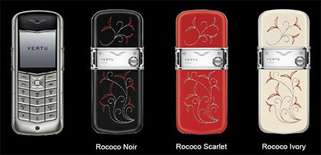 черном Rococo Noir (Рококо черный) ярко-красном Rococo Scarlet (Рококо Скарлет) кремовом Rococo Ivory (Рококо слоновая кость) и эксклюзивном Rococo Sapphire. Эксклюзивная модель телефона Vertu Constellation Rococo Sapphire украшена натуральными не ограненными синими сапфирами, а корпус телефона, отполированный вручную, обрамлен выгравированным цветочным орнаментом. Во всех телефонах присутствует технология полировки стали с маркированными кнопками. Сапфировое стекло, предохраняет Rococo, как и любой другой телефон Vertu от повреждений, а подушечка из керамики противодействует тепловому воздействию.